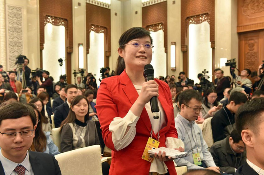 Repórter do Diário do Povo pergunta ao porta-voz da primeira sess?o anual do 13o Comitê Nacional da Conferência da Consulta Política do Povo Chinês (CCPPCh) em uma coletiva de imprensa, a 2 de mar?o de 2018. (Lei Sheng/Diário do Povo)