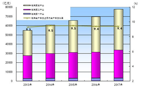 O produto oceanico representa a soma do valor agregado da indústria marítima e das indústrias relacionadas com o mar. Em 2017, a indústria marítima do país manteve um crescimento estável. O valor agregado das principais indústrias marítimas ascendeu aos 3,17 trilh?es de yuans, um aumento anual de 8,5%. Já o valor agregado das indústrias de pesquisa científica, educa??o, gest?o e servi?os marítimos foi de 1,65 trilh?o de yuans, um crescimento anual de 11,1%.