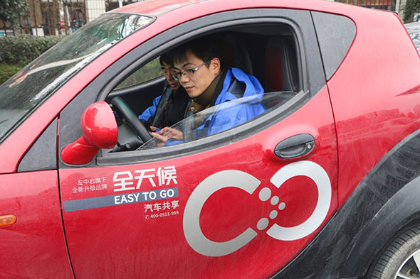 No dia 11 de fevereiro de 2018, o primeiro lote de 100 carros compartilhados, de manuten??o fácil, fez a sua estréia nas ruas da cidade de Tonglu, na província de Zhejiang. A imagem mostra um membro da equipe demonstrando como usar o veículo. Fonte da imagem: Visual China