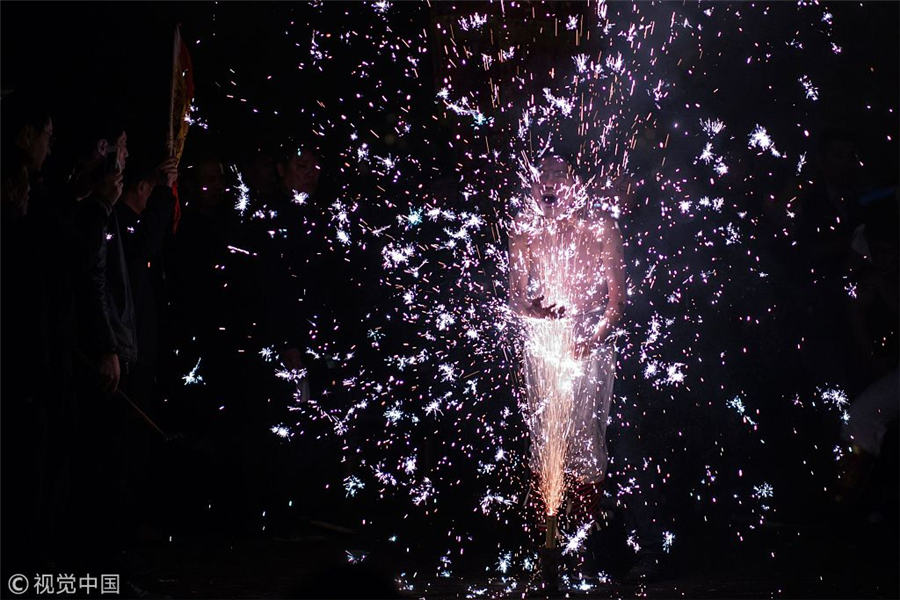 Durante o ritual, um homem se inclina sobre um fluxo de fogos-de-artifício e atua como se estivesse comendo as fagulhas. Com a fuma?a em ascens?o e as faíscas que atacam seu corpo, o evento se torna um símbolo de valor e vigor, concedido pelas antigas divindades.
