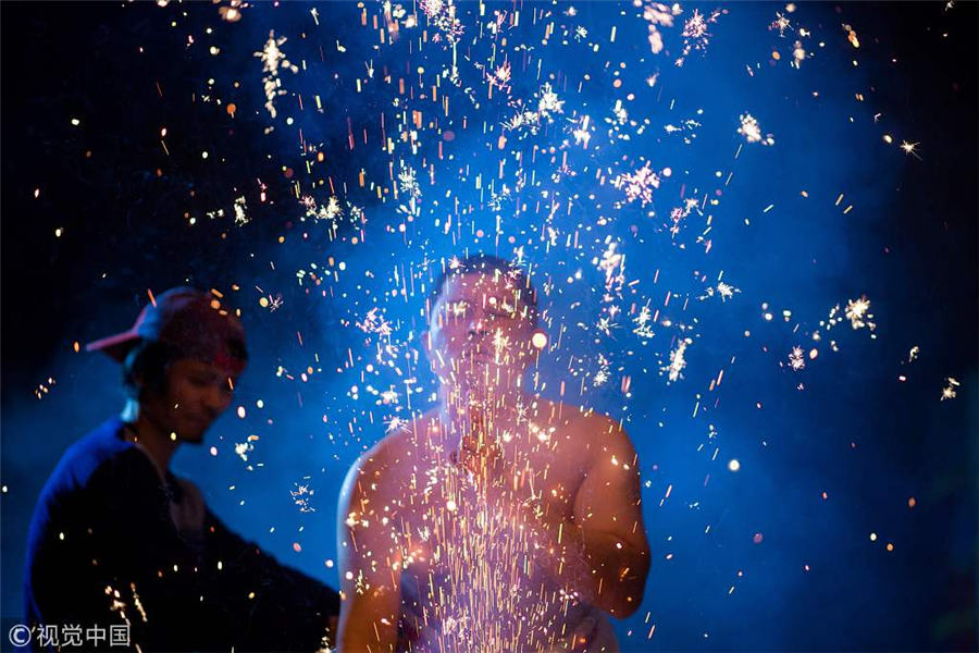 Durante o ritual, um homem se inclina sobre um fluxo de fogos-de-artifício e atua como se estivesse comendo as fagulhas. Com a fuma?a em ascens?o e as faíscas que atacam seu corpo, o evento se torna um símbolo de valor e vigor, concedido pelas antigas divindades.