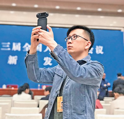 Jornalista do Diário do Povo faz vídeo panoramico em realidade virtual durante uma coletiva de imprensa da 1a sess?o da 13a Assembleia Popular Nacional.