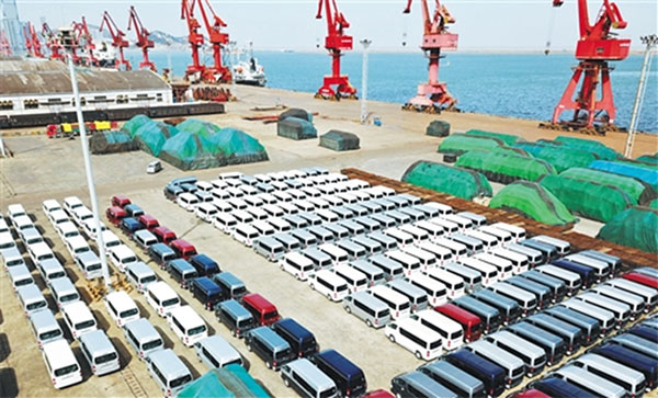 Um lote de carros produzidos na China à espera para serem exportados no Porto Lianyungang, na província de Jiangsu, a 5 de mar?o. De janeiro a fevereiro deste ano, o porto de Lianyungang totalizou 39.33.6300 toneladas de carga, um aumento de 4% em termos anuais. (Fonte: Economic Daily)
