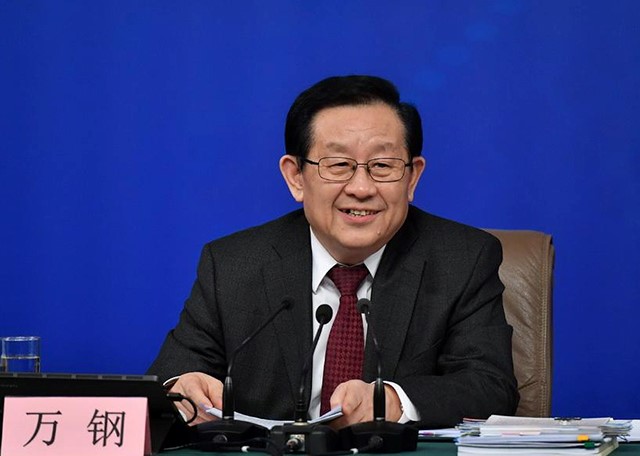 O ministro da Ciência e Tecnologia, Wan Gang, conversa com os jornalistas, durante uma coletiva de imprensa, durante uma reuni?o da APN, sobre como "acelerar a constru??o de um país inovador" e quest?es relacionadas.