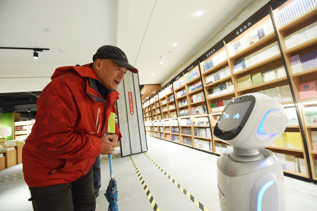 Leitores interagem com o rob? de inteligência artificial "Xinxin", numa livraria em Hangzhou, a 15 de dezembro de 2017,