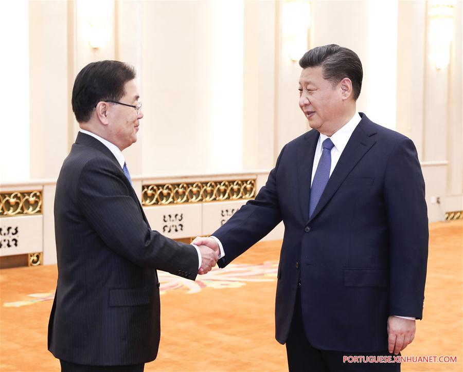 Beijing, 13 mar (Xinhua) -- O presidente da China, Xi Jinping, reuniu-se com Chung Eui-yong, mais alto consultor de seguran?a nacional do presidente da República da Coreia, Moon Jae-in, na segunda-feira em Beijing.