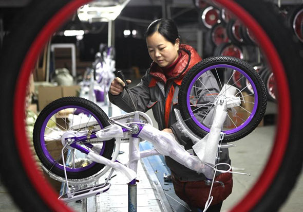 Operária monta pe?as de bicicleta em uma fábrica no distrito de Quzhou, na província de Henan, a 24 de janeiro de 2018. (Hu Gaolei/Diário do Povo)