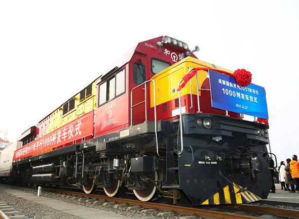 O 1000o trem China-Europa parte da esta??o ferroviária internacional de Chengdu, a 27 de dezembro de 2017. (Bai Guibin/Diário do Povo)