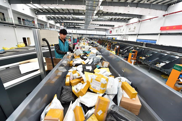 Pacotes com destino ao resto do mundo s?o organizados nos correios de Yiwu, na província de Zhejiang, a 7 de mar?o de 2018. (Lyu Bin/Diário do Povo)