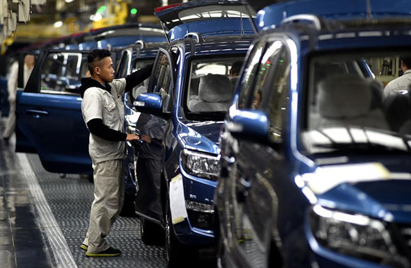 Trabalhadores da Dongfeng Liuzhou Motor Co., Ltd. examinam automóveis em linha de produ??o. (Foto: Diário do Povo)