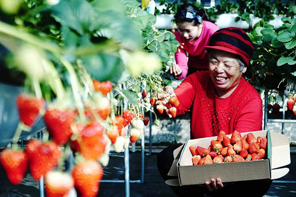 Meng Xiangmei, agricultora no Distrito de Miyun, em Beijing, colhe morangos. (He Yong/Diário do Povo)
