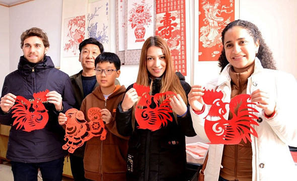 Estrangeiros aprendem corte de papel com um artista folclórico em Dongying, na província de Shandong, a 23 de dezembro de 2017. (Foto: Diário do Povo)