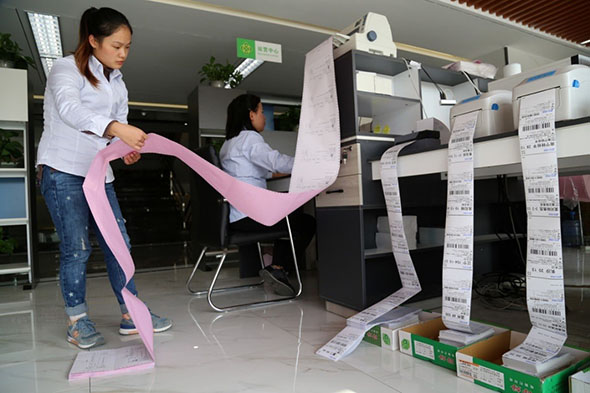 Funcionários de uma empresa de comércio eletr?nico imprimem encomendas no distrito de Wenxian, na província de Henan. (Xu Hongxing/Diário do Povo)