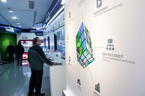 Estrangeiro experimenta instala??es no centro de informa??es de “governan?a inteligente” no distrito de Tonglu, na província de Zhejiang, a 29 de janeiro de 2018. (Foto: Diário do Povo)
