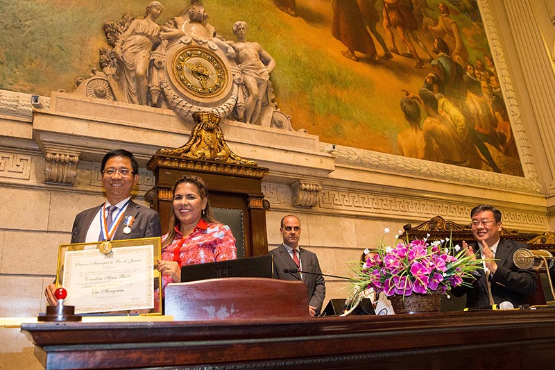 Tania Bastos, membro da Camara Municipal do Rio de Janeiro, concedeu uma medalha a Cai Hongxian. (Xinhuanet/Li Mingshe)