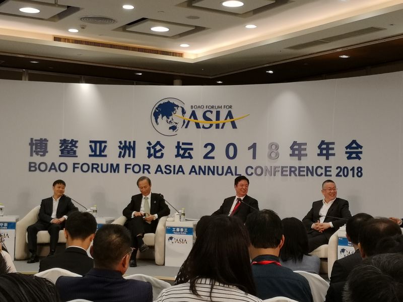 Liu Hualong (3a pessoa a partir da esquerda), presidente da CRRC, participa Conferência Anual do Fórum Boao para a ásia, na cidade de Boao, província de Hainan, no sul da China, em 9 de abril de 2018.