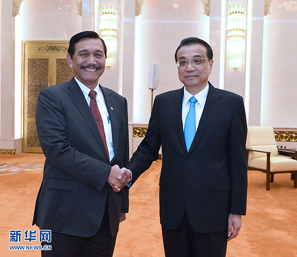 Beijing, 13 abr (Xinhua) -- O primeiro-ministro chinês, Li Keqiang, se reuniu nesta quinta-feira em Beijing com Luhut Binsar Pandjaitan, enviado presidencial e ministro coordenador dos Assuntos Marítimos da Indonésia.