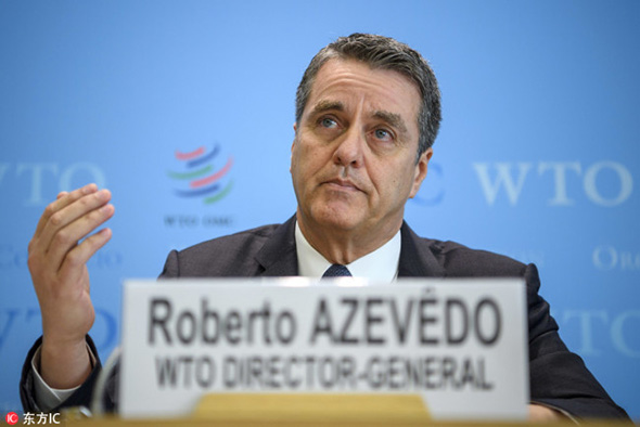 Roberto Azevêdo, diretor geral da OMC, fala durante uma conferência de imprensa sobre o Relatório de 2017 do World Trade da OMC na sede da organiza??o em Genebra, Suí?a, no dia 12 de abril de 2018.