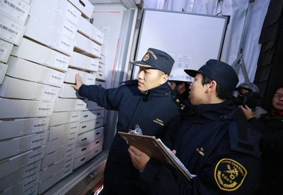 Os funcionários da alfandega de Shanghai inspecionam a carne importada da Europa
