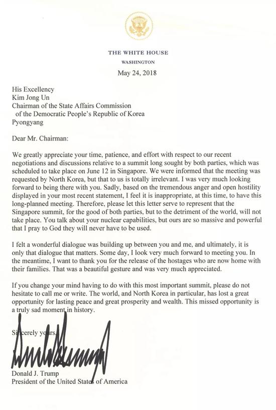 Na carta emitida pela Casa Branca, Trump refere que, embora estivesse ansioso pelo encontro com Kim, este seria “inapropriado” nesta altura, “com base no tremendo ódio e hostilidade aberta” protagonizados pela RPDC nos seus mais recentes comunicados.