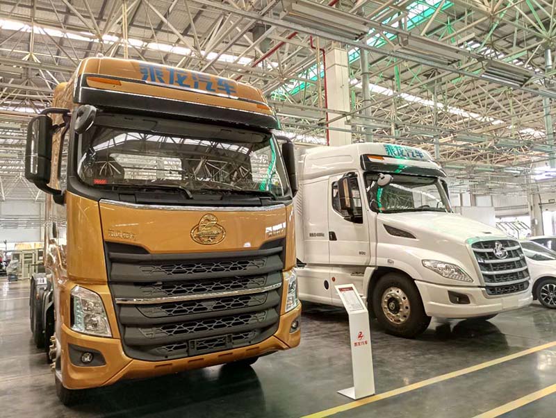 Modelos de caminh?o europeu (esquerda) e americano (direita) da Doufeng Liuzhou Motor Co. Ltd., capazes de transportar cargas até 50 toneladas.