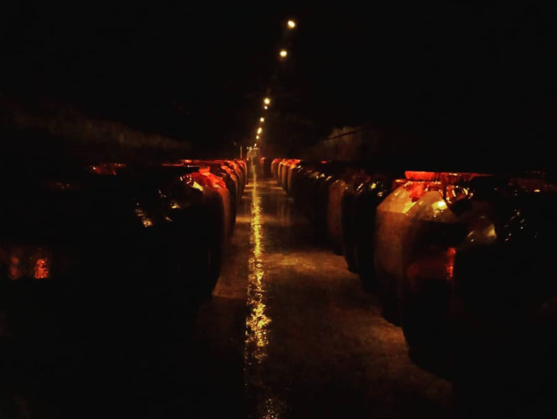 Baijiu do ano 2015, armazenado na gruta. Os potes aparentam maior longevidade devido ao bolor acumulado no seu exterior, causado pelo elevado grau de humidade da cave, mas sem qualquer influência na qualidade do licor. Tal como outros vinhos e licores em outros países, a qualidade do baijiu é proporcional à sua idade – quanto mais velho, melhor -, fator que influencia também o pre?o por litro, explicou uma funcionária.