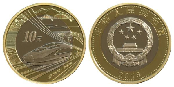 Segundo o comunicado, a cara da moeda tem um emblema nacional no meio, com os caracteres chineses de "República Popular da China" e "2018" na parte superior e inferior da moeda. A coroa é composta pelo trem-bala "Fuxing", a Ponte Dashengguan do Rio Yangtze, a Esta??o Sul de Beijing, montanhas, socalcos e um deserto. Os caracteres chineses para "Fuxing- Ferrovia de alta velocidade" podem ser vistos na parte inferior.