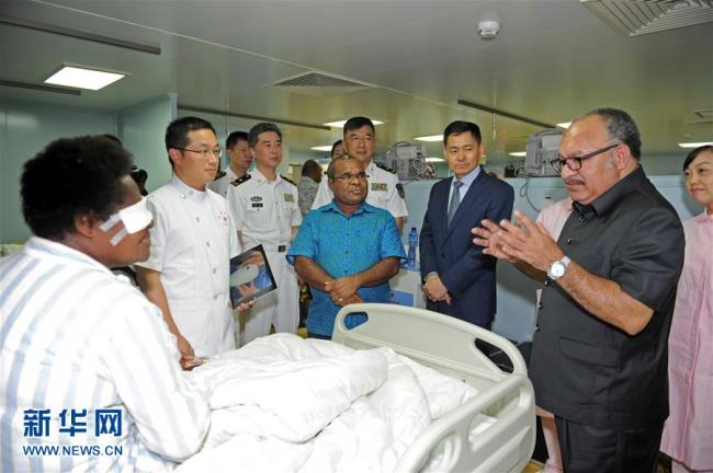 Durante a sua visita ao navio hospital, O’Neill inspecionou a guarda de honra naval, na companhia do embaixador chinês em Papua-Nova Guiné, Xue Bing, e dos comandantes da miss?o.