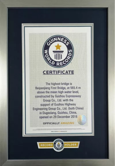 GUIYANG, 21 de set (Diário do Povo Online) -“A ponte mais alta do mundo é a Ponte Beipanjiang, a 565,4 metros acima do nível médio da água do mar”, pode ler-se no certificado emitido pelo Guinness World Records, para a ponte localizada no desfiladeiro situado entre as províncias de Yunnan e Guizhou, informou uma fonte da imprensa local de Guizhou na quarta-feira.