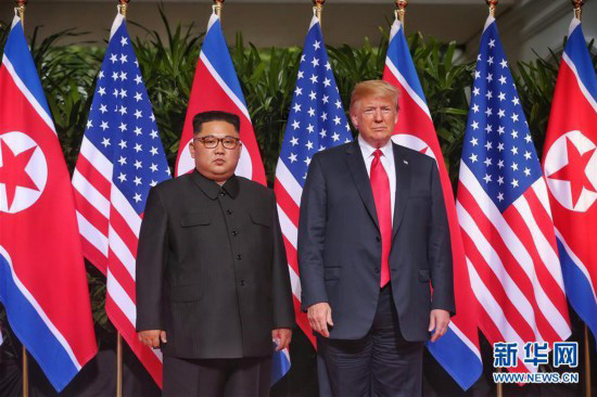 O líder da RPDC, Kim Jong Un, e o presidente dos EUA, Donald Trump, reúnem-se em Singapura, a 12 de junho de 2018. (Foto/Xinhua)