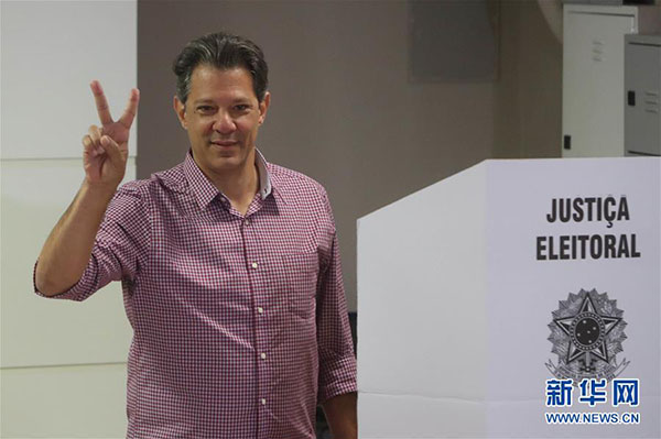 Rio de Janeiro, 7 out (Xinhua) -- Fernando Haddad, uma estrela política em ascens?o do Partido dos Trabalhadores (PT), irá concorrer contra o candidato de extrema-direita, Jair Bolsonaro, no segundo turno no final deste mês.