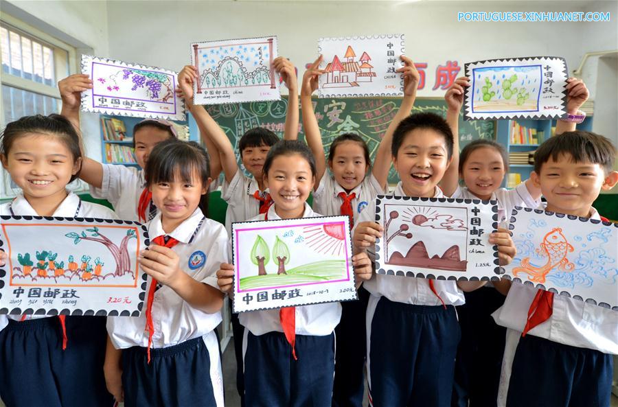 Estudantes exibem desenhos de selos feitos por eles em uma escola primária de Hansan em Handan, província de Hebei, norte da China, em 9 de outubro de 2018. Os alunos da escola aprenderam sobre conhecimento postal através de várias atividades no Dia Mundial dos Correios.