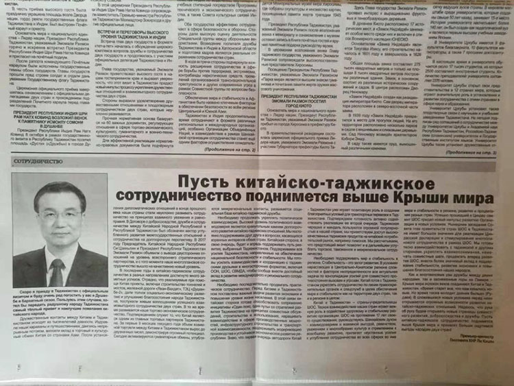 "A China está pronta para promover a coordena??o e a coopera??o com o Tadjiquist?o sob marcos multilaterais, como a ONU, a OCS e a Conferência sobre Intera??o e Medidas de Constru??o de Confian?a, e contribuir juntos para a promo??o da coopera??o internacional e regional", disse Li.