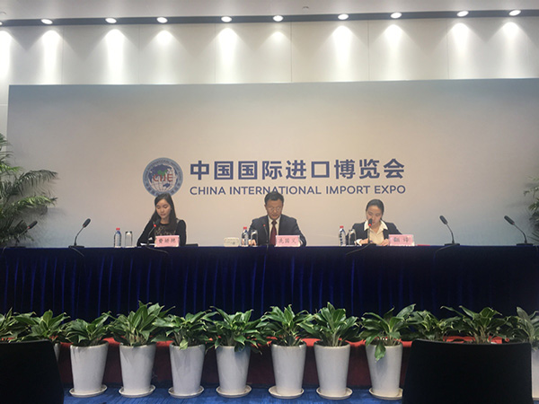 Xian Guoyi (centro), chefe do departamento de comércio de servi?os do Ministério do Comércio da China, assiste a uma coletiva de imprensa durante a Exposi??o Internacional de Importa??o da China. [Jing Shuiyu /chinadaily.com.cn]