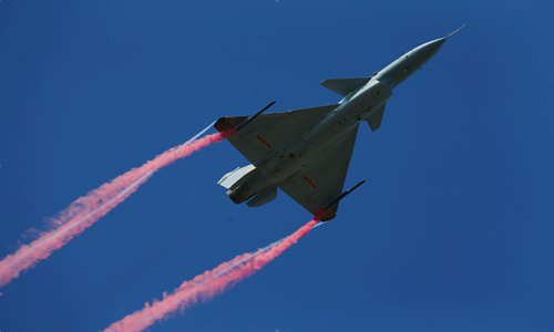 Ca?a J-10B, alimentado pelo motor WS-10 Taihang, realiza várias manobras no Airshow China 2018. (Foto: Cui Meng/GT)