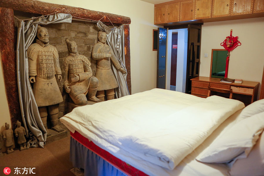 Guo colocou mais de 200 réplicas de guerreiros nas três salas de hotel, que ele nomeou como pit um, dois e três. As esculturas est?o embaixo das camas, dos lavatórios, em frente aos assentos sanitários e nas paredes. Telhas e fronhas também s?o pintadas com imagens dos soldados de rosto severo.
