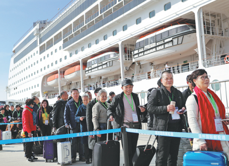 Turistas idosos preparam-se para embarcar em um navio de cruzeiro na província de Wenzhou, Zhejiang.