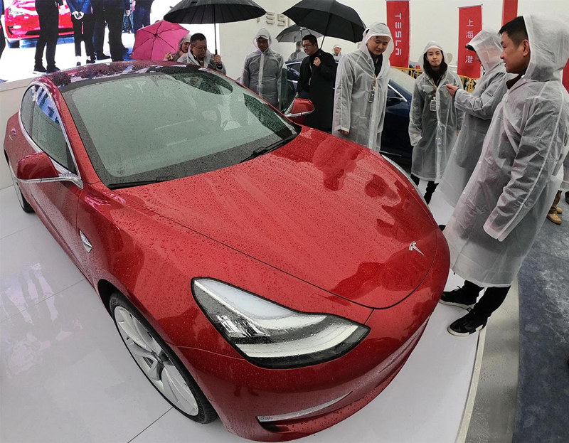 Um carro elétrico Tesla Model 3 é exibido em uma cerim?nia de início da constru??o da fábrica da Tesla, em Shanghai, em 7 de janeiro.