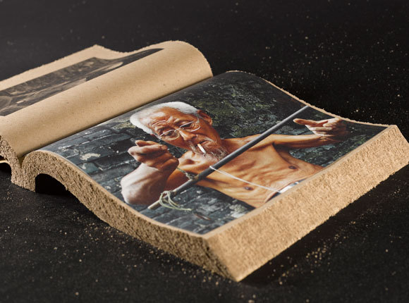 Os designers recorreram ao papel barato que as lojas usam para embrulhar alimentos para dar forma ao livro suprarreferido. O livro contém várias imagens impressas a preto e branco.