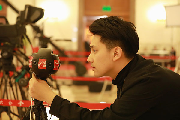 Na pra?a diante do Grande Sal?o do Povo, um tripé com uma camara panoramica trabalha silenciosamente. O sinal de vídeo capturado pela camara é transmitido de volta para o Centro de Imprensa através do sinal 5G, e depois apresentado a milh?es de internautas na China através do aplicativo do Diário do Povo. A transmiss?o nos aparelhos dos internautas quase os transportam até ao local dos eventos – ao rodar o aparelho móvel é possível obter uma vis?o de diferentes angulos.