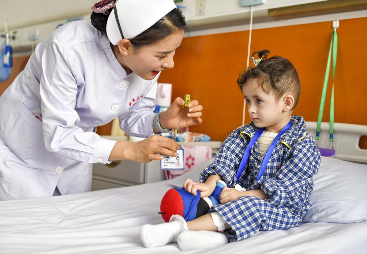 Uma enfermeira chinesa conversa com uma menina afeg? que, por doen?a cardíaca congênita, está internada no Primeiro Hospital Filiado à Universidade Médica de Xinjiang, em Urumqi, a 6 de novembro de 2018.[Foto/CHINA NEWS SERVICE]