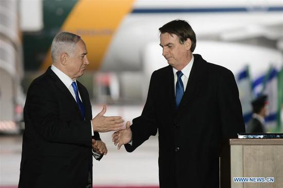 O presidente do Brasil Jair Bolsonaro (D) cumprimenta o primeiro-ministro de Israel Benjamin Netanyahu durante a cerim?nia de boas vindas no Aeroporto Ben Gurion, perto de Tel Aviv, Israel, a 31 de mar?o, 2019. Bolsonaro chegou em Israel no domingo para uma visita oficial, onde era esperado para anunciar se a Embaixada do Brasil será transferida de Tel Aviv para Jerusalém.