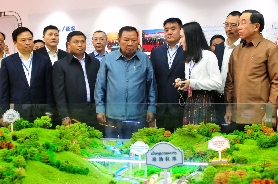 Bounnhang Vorachith (centro), secretário-geral do Comitê Central do Partido Revolucionário Popular do Laos e presidente do Laos, visita o Sal?o de Exposi??es da Ferrovia China-Laos durante sua inspe??o do Projeto Ferroviário China-Laos, construído pelo Grupo de Engenharia da Ferrovia China No.2 (CREC-2), em Vientiane, Laos, em 5 de abril de 2019. Bounnhang Vorachith disse na sexta-feira que a Ferrovia China-Laos, como a implementa??o da Iniciativa Cintur?o e Rota, irá beneficiar o povo do Laos. (Xinhua/Zhang Jianhua)