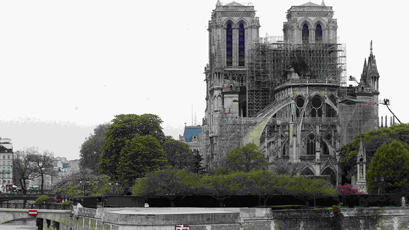 O pináculo e o telhado colapsaram após o fogo ter consumido o marco parisiense de 850 anos. A estrutura principal e as duas torres permaneceram incólumes.