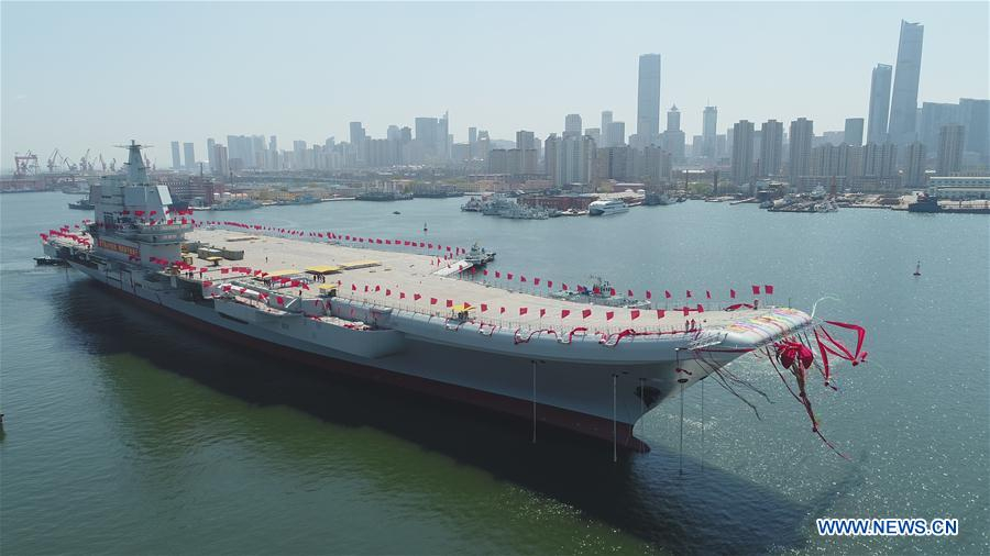 O segundo porta-avi?es da China é transferido da doca seca para a água numa cerim?nia de lan?amento no estaleiro da China Shipbuilding Industry Corp., em Dalian, a Nordeste da província de Liaoning da China, a 26 de abril, 2017.