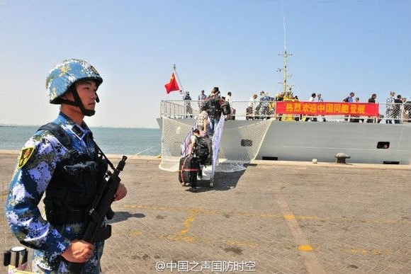 Em 29 de mar?o de 2015, a fragata “Linyi”, que se encontrava nas águas da Somália para cumprir uma miss?o de escolta, retirou do porto de Adem 124 cidad?os chineses residentes no Iêmen. Até o dia 7 de abril, a marinha chinesa eviou 3 navios de guerra para retirar 621 cidad?os chineses e 276 cidad?os estrangeiros.