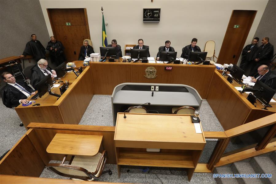 O Juiz relator do Tribunal Superior de Justi?a (STJ) do Brasil, Felix Fischer (2 -i), participa na revis?o do julgamento do ex-presidente brasileiro Lula da Silva, em Brasília, Brasil, a 23 de abril, 2019. O Juiz relator Felix Fischer, do STJ do Brasil, prop?s na ter?a-feira vota??o para reduzir a condena??o do ex-presidente Lula da Silva, em Curitiba, 12 anos e um mês de pris?o por oito anos e dez meses de pris?o. (Xinhua / Lucius Tavora)