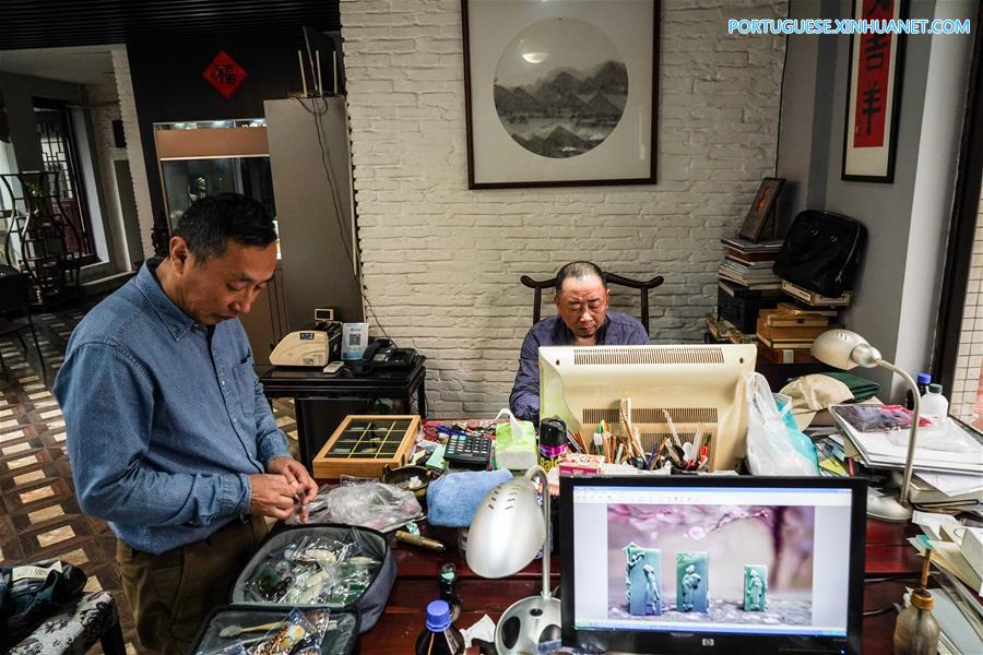 Os artistas Lin Min (e) e Lu Wei trabalham em sua oficina em Suzhou, província de Jiangsu, leste da China, em 29 de abril de 2019. Lu Wei e Lin Min, artistas que trabalharam como fabricantes de leques e designers de desenho animado, iniciaram posteriormente a carreira de escultura de jade. Preservando o tradicional estilo de Suzhou de textura de escultura requintada, eles também se esfor?am para realizar novos projetos com toque moderno. (Xinhua/Yang Lei)