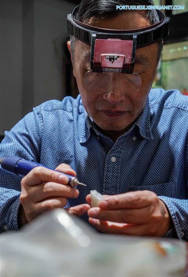 O artistas Lin Min trabalha em um nova pe?a de jade em sua oficina em Suzhou, província de Jiangsu, leste da China, em 29 de abril de 2019. Lu Wei e Lin Min, artistas que trabalharam como fabricantes de leques e designers de desenho animado, iniciaram posteriormente a carreira de escultura de jade. Preservando o tradicional estilo de Suzhou de textura de escultura requintada, eles também se esfor?am para realizar novos projetos com toque moderno. (Xinhua/Yang Lei)