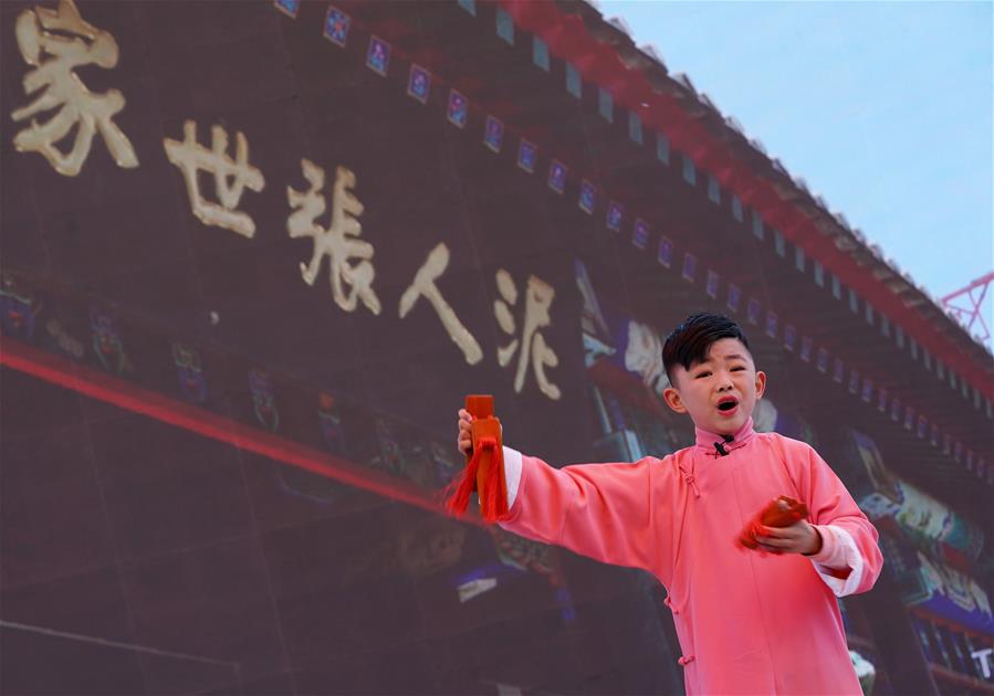 Um jovem ator interpreta Kuaiban, uma forma de contar histórias chinesas acompanhada de badalos de bambu, durante o evento "Dia de Tianjin" realizado como parte da Exposi??o Internacional de Horticultura de Beijing no distrito de Yanqing, em Beijing, capital da China, em 5 de maio de 2019. (Xinhua/Ju Huanzong)